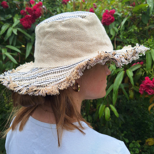 Unisex HERRINGBONE and GHERI OUTBACK CREAM hat with a flexible, fringed and lined brim. Beautiful pure Cotton and Fairtrade.