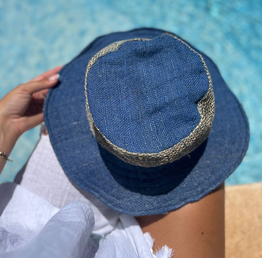 Beautiful Hemp Unisex washed Blue BORLA OUTBACK hat with a flexible, fringed brim