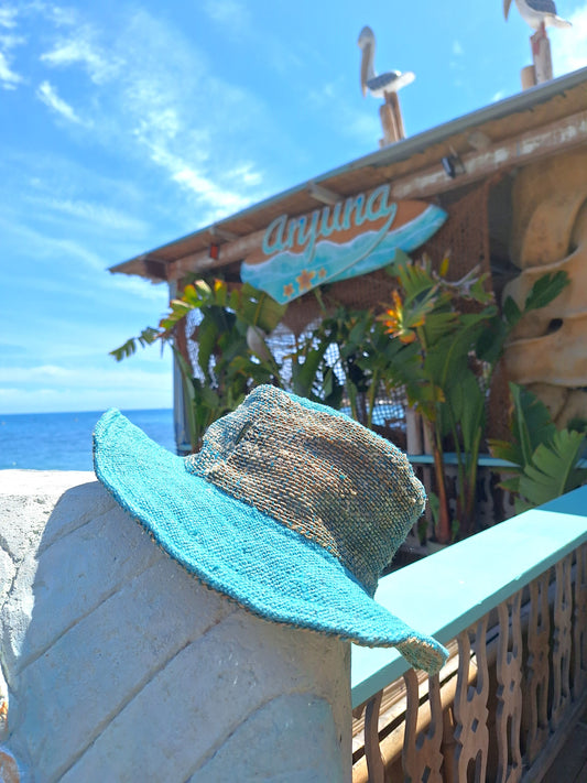 Beautiful Hemp Unisex washed Turquoise BORLA OUTBACK hat with a flexible, fringed brim