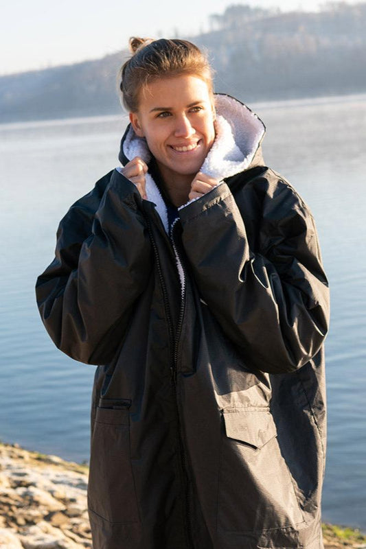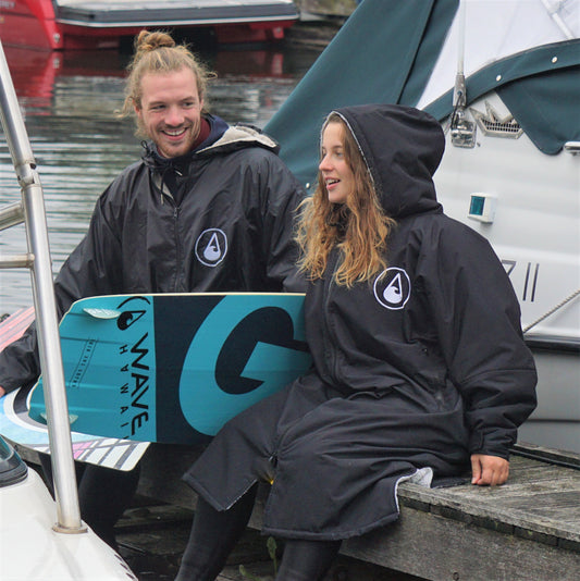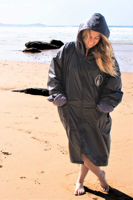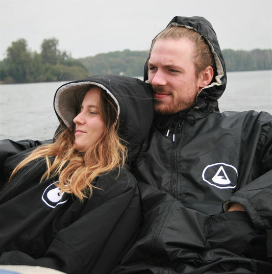 The outer material of our Storm Ponchos are both waterproof and windproof and the inside is a very comfortable 100% fluffy cotton (certified Oeko-Tex Standard 100). The carefully selected fabrics are particularly cozy and kind to your skin. This poncho has very warm side pockets and a fully towelling-lined hood. They offer plenty of space for carrying your stuff and are especially great for warming your hands on those chilly days on the beach!